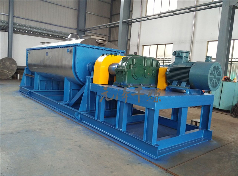 空心軸上密集排列著楔型中空漿葉,熱介質(zhì)經(jīng)空心軸流經(jīng)漿葉。單位有效容積內(nèi)傳熱面積很大,熱介質(zhì)溫度從-40℃到320℃,可以是水蒸汽,也可以是液體型:如熱水、導(dǎo)熱油等。間接傳導(dǎo)加熱,沒有攜帶空氣帶走熱量,熱量均用來加熱物料。熱量損失僅為通過器體保溫層向環(huán)境的散熱。楔型漿葉傳熱面具有自清潔功能。物料顆粒與楔型面的相對運(yùn)動產(chǎn)生洗刷作用,能夠洗刷掉楔型面上附著物料,使運(yùn)轉(zhuǎn)中一直保持著清潔的傳熱面。漿葉干燥機(jī)的殼體為Ω型,殼體內(nèi)一般安排二到四根空心攪拌軸。殼體有密封端蓋與上蓋,防止物料粉塵外泄而充分發(fā)揮作用。