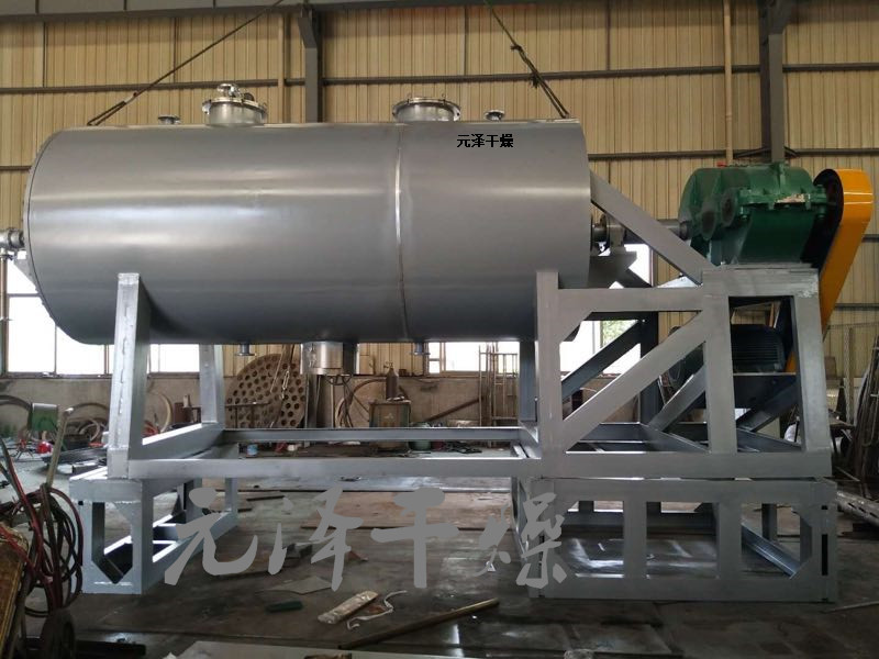 真空耙式干燥機是一種新穎臥式間歇式真空干燥設備,濕物料經傳導蒸發(fā),帶有刮板攪拌器不斷清除熱面上的物料,并在容器內推移形成循環(huán)流,水份蒸發(fā)后由真空泵抽出。本機采用大面積夾層加熱方式,傳熱面大,熱效率高,設置攪拌,使物料在筒內形成連續(xù)循環(huán)狀態(tài),進一步提高了物料受熱的均勻度,從而可順利進行漿狀、膏狀、糊狀物料干燥。