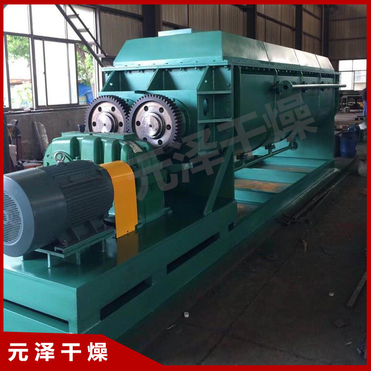 推進物料:槳葉在攪拌軸上有一定的軸向角度,在攪拌的同時能夠?qū)⑽锪蠌倪M料口向出料口方向推進,使物料在干燥機內(nèi)從加料口向出料口運動基本呈活塞運動,實現(xiàn)連續(xù)干燥。