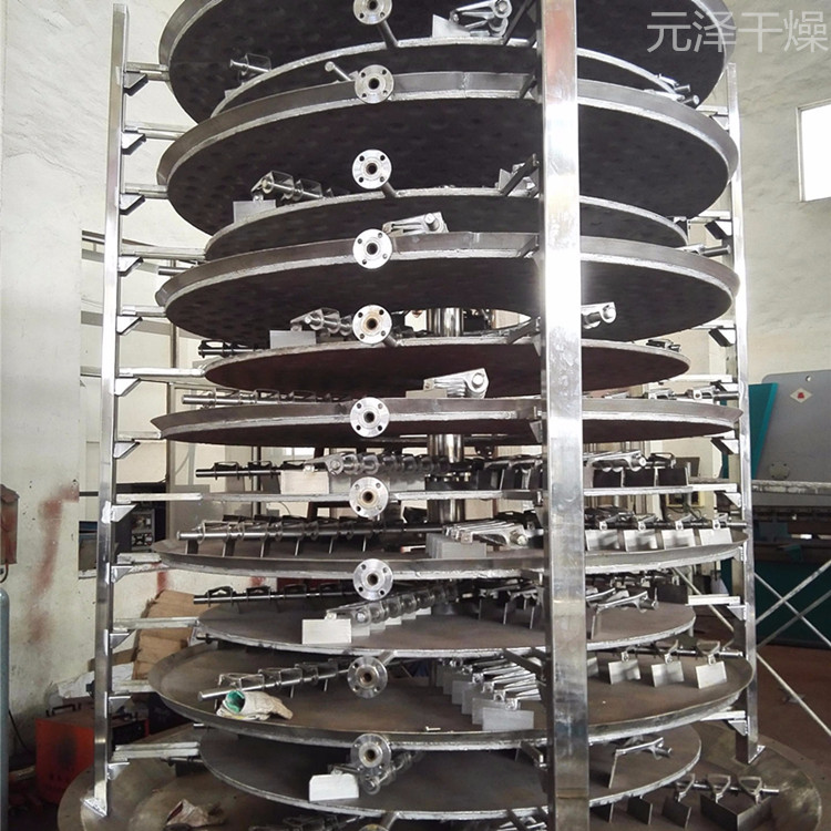 濕物料自加料器連續(xù)地加到干燥器上部層干燥盤上,帶有耙葉的耙臂作回轉(zhuǎn)運(yùn)動使耙臂作回轉(zhuǎn)運(yùn)動使耙葉連續(xù)地翻抄物料。物料沿指數(shù)螺旋線流過干燥盤表面,在小干燥盤上的物料被移送到外緣,并在外緣落到下方的大干燥盤外緣,在大干盤上物料向里移動并從中間落料口落如下一層小干燥盤中。大小干燥盤上下交替排列,物料得以連續(xù)地流過整個(gè)干燥器。中空的干燥盤內(nèi)通入加熱介質(zhì),加熱介質(zhì)形式有飽和蒸汽、熱水和導(dǎo)熱油,加熱介質(zhì)由干燥盤的一端進(jìn)入,從另一端導(dǎo)出。已干物料從后一層干燥盤落到殼體的底層,后被耙葉移送到出料口排出。濕份從物料中逸出,由設(shè)在頂蓋上的排濕口排出,真空型盤式干燥器的濕氣由設(shè)在頂蓋上的真空泵口排出。從底層排出的干物料可直接包裝。通過配加翅片加熱器、溶劑回收冷凝器、袋式除塵器、干料返混機(jī)構(gòu)、引風(fēng)機(jī)等輔機(jī),可提高其干燥的生產(chǎn)能力,干燥膏糊狀和熱敏性物 料,可方便地回收溶劑,并能進(jìn)行熱解和反應(yīng)操作。