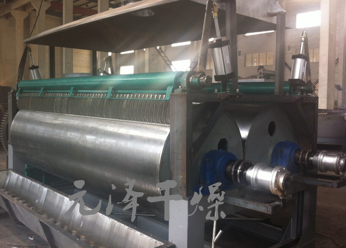 3、啟動電機,主滾筒動運轉(zhuǎn)平穩(wěn),溫度升高后加入物料后調(diào)整電機轉(zhuǎn)速及物料在滾筒上薄膜均勻程度來控制物料終含水量。