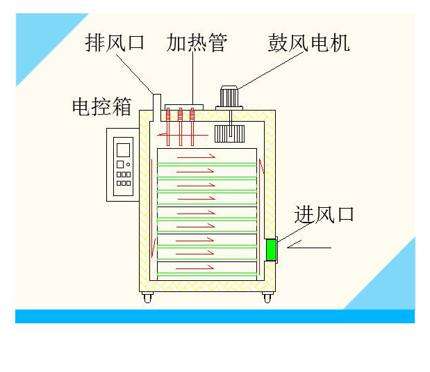 立龍熱風(fēng)循環(huán)烘箱原理:在設(shè)備的兩側(cè)及箱頂帶有熱風(fēng)循環(huán)風(fēng)道,從爐內(nèi)兩側(cè)均勻水平送風(fēng),箱內(nèi)溫度均勻。
