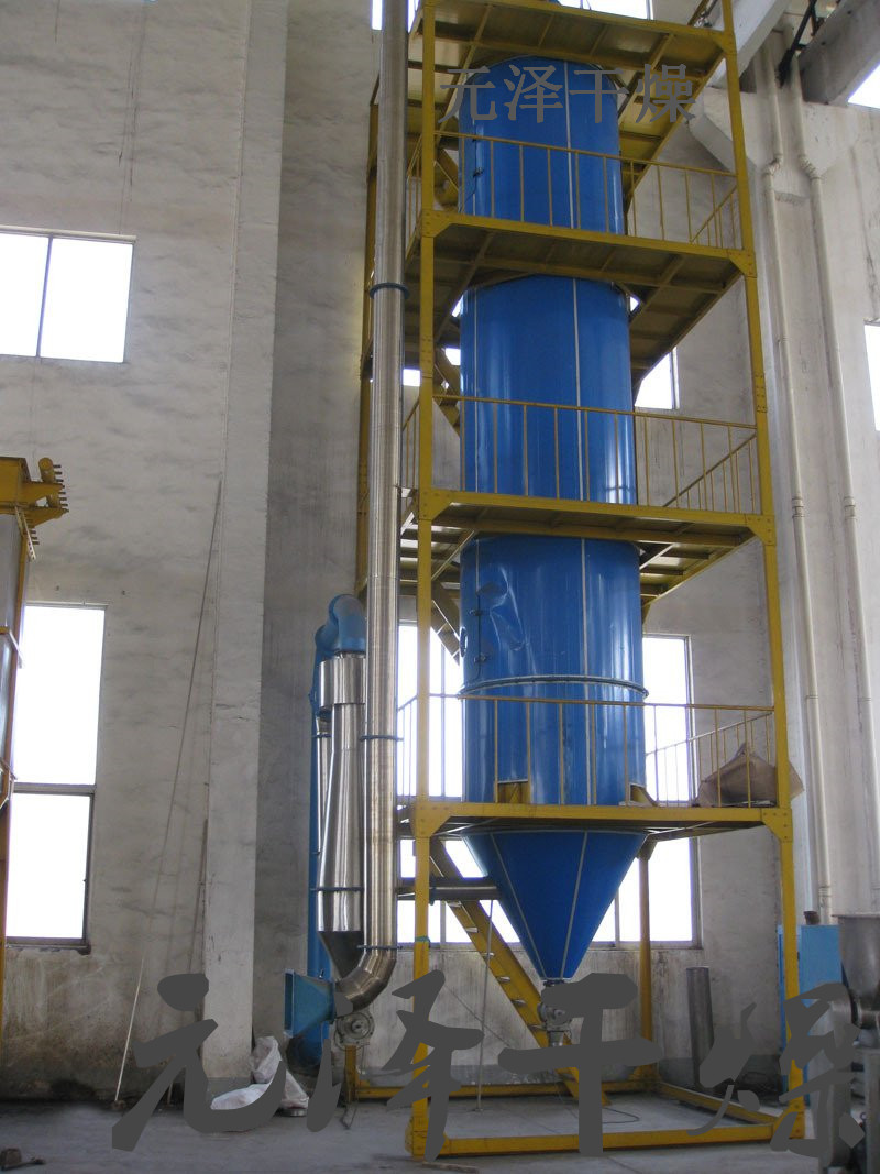 壓力噴霧干燥機(jī)工作過程為:料液通過隔膜泵高壓輸入,噴出霧狀液滴,然后同熱空氣并流下降,大部分粉粒由塔底排料口收集,廢氣及其微小粉末經(jīng)旋風(fēng)分離器分離,廢氣由抽風(fēng)機(jī)排出,粉末由設(shè)在旋風(fēng)分離器下的收粉筒收集,風(fēng)機(jī)出口處還可裝備二級除塵裝置,回收率在96%-98%。