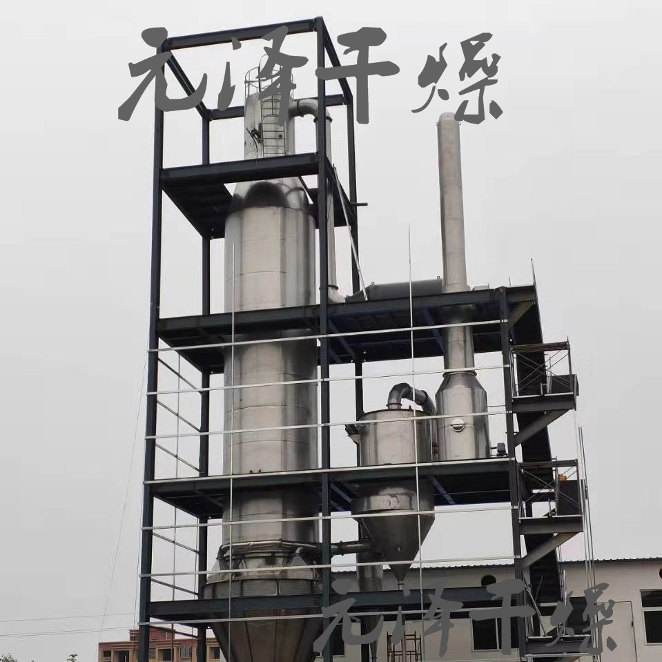 壓力噴霧干燥機工作過程為:料液通過隔膜泵高壓輸入,噴出霧狀液滴,然后同熱空氣并流下降,大部分粉粒由塔底排料口收集,廢氣及其微小粉末經(jīng)旋風分離器分離,廢氣由抽風機排出,粉末由設在旋風分離器下的收粉筒收集,風機出口處還可裝備二級除塵裝置,回收率在96%-98%。