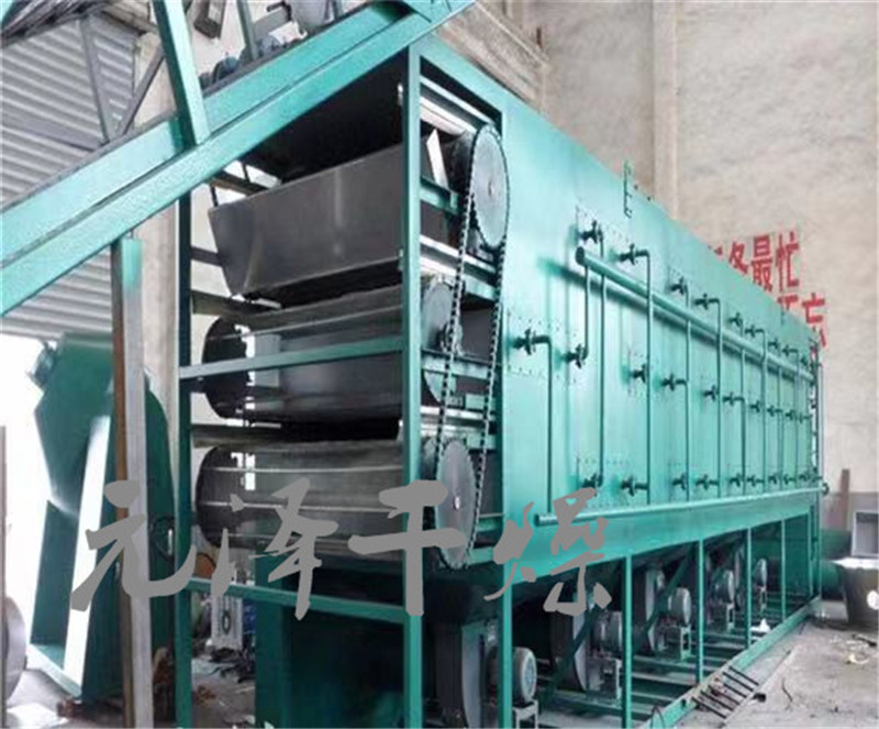 物料由加料器均勻地鋪在網(wǎng)帶上,網(wǎng)帶一般采用12-60目不銹鋼絲網(wǎng),由傳動(dòng)裝置拖動(dòng)在干燥機(jī)內(nèi)移動(dòng)。干燥機(jī)由若干單元組成,每一單元熱風(fēng)獨(dú)立循環(huán),部分尾氣由專門排濕風(fēng)機(jī)排出,廢氣由調(diào)節(jié)閥控制,熱氣由下往上或由上往下穿過(guò)鋪滿物料的網(wǎng)帶完成熱量與質(zhì)量傳遞的進(jìn)程,帶走物料水份。網(wǎng)帶緩慢移動(dòng),運(yùn)行速度可根據(jù)物料溫度自由調(diào)節(jié),干燥后的成品連續(xù)落入收料器中。上下循環(huán)單元根據(jù)用戶需要可靈活配備,單元數(shù)量亦可根據(jù)需要選取。