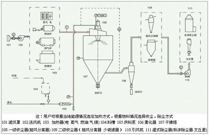 噴霧干燥機為開式循環(huán),并流式,離心式霧化。干燥介質空氣經(jīng)過初、中效空氣過濾器過濾后根據(jù)操作指令由鼓風機吸取再經(jīng)加熱器加熱通過高效過濾器的熱風分配器進入噴霧干燥主塔。液體物料根據(jù)操作指令經(jīng)過蠕動泵,進入高速旋轉的離心噴頭,在離心力作用下被分散成小霧滴。在噴霧干燥主塔內,小霧滴與熱風在充分接觸,沿其特定路徑進行熱交換后被干燥成為產(chǎn)品,然后通過旋風分離器實現(xiàn)分離,固體物料被收集,氣體介質再經(jīng)過過濾后被排出。整套噴霧系統(tǒng)易清潔、無死角,符合GMP要求。